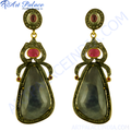 These exquisite drop earrings feature a stunning arrangement of sapphire and ruby gemstones, set in a gold-plated base. Each earring showcases a large, faceted sapphire complemented by smaller ruby accents. The earrings are designed for a comfortable and secure fit. These elegant drop earrings are ideal for adding a touch of sophistication to any outfit. Perfect for those seeking unique, quality jewelry, these earrings combine the beauty of sapphires and rubies with a durable gold-plated setting. A beautiful design for daily wear or gifting.