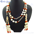 Multi-strand necklace featuring white pearls and orange carnelian beads, perfect for women's fashion