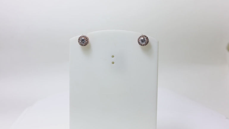 These exquisite stud earrings feature a halo design, crafted with rose gold plating. The earrings are adorned with sparkling cubic zirconia stones, offering a brilliant shine. The earrings are secured with a post and push back closure for comfortable and secure wear. These earrings are ideal for sensitive ears. These earrings are a classic addition to any jewelry collection. These earrings are great for those looking for everyday wear or a thoughtful gift.