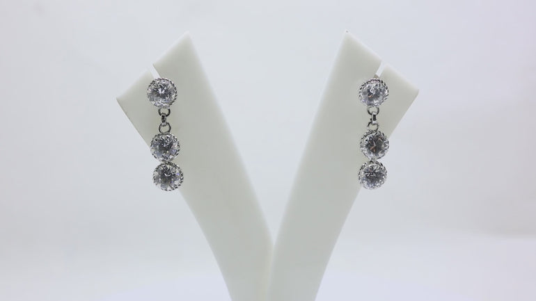 These elegant earrings feature a classic three-stone dangle design crafted from high-quality 925 sterling silver. Each earring showcases sparkling cubic zirconia stones, offering brilliant clarity and shine. The earrings are nickel-free and hypoallergenic, suitable for sensitive ears. These earrings are perfect for adding a touch of sophistication to any outfit. The secure post-and-clutch closure ensures a comfortable and reliable fit. Ideal for daily wear or gifting, these earrings make a perfect choice.