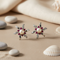 Silver Pearl & Ruby Flower Stud Earrings | Women's Floral Jewelry