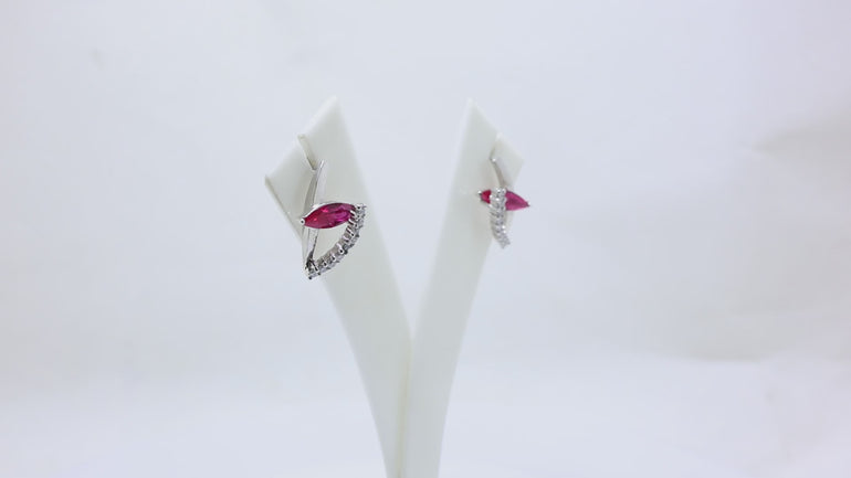 These elegant earrings feature a unique design crafted from genuine 925 sterling silver. The earrings incorporate sparkling white cubic zirconia and a vibrant ruby gemstone. The earrings are rhodium-plated for enhanced shine and durability. They are hypoallergenic, making them suitable for sensitive skin. These earrings are designed for a comfortable fit and are ideal for daily wear or gifting. These earrings are perfect for adding a touch of elegance to any outfit. The dimensions of the earrings are optimized for both comfort and style.
