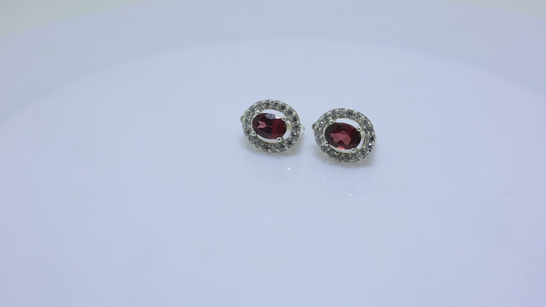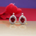 These elegant stud earrings are crafted from high-quality 925 sterling silver, ensuring durability and a brilliant shine. Each earring features a vibrant, oval-cut ruby gemstone, securely set within a halo of sparkling cubic zirconia. The earrings are designed for comfortable and secure wear, making them ideal for sensitive ears. The rhodium plating enhances the silver's luster and provides tarnish resistance. These ruby stud earrings are a perfect gift for her and suitable for various occasions, from daily wear to special events.