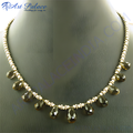 This elegant necklace features genuine smoky quartz gemstones and gold plating-tone beads. The necklace is crafted with high-quality materials, ensuring durability and a beautiful finish. Each smoky quartz stone is carefully selected for its clarity and unique color. The necklace is designed for comfort and ease of wear. This exquisite piece is an ideal choice for adding a touch of sophistication to any outfit or gifting to a loved one. The necklace showcases a blend of natural beauty and timeless elegance, perfect for daily wear or special occasions.