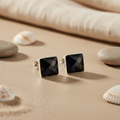 These elegant stud earrings feature a striking square design with genuine black onyx gemstones set in polished 925 sterling silver. The earrings showcase the natural beauty and deep color of the onyx, known for its protective properties. The studs have a secure post-and-clutch closure for comfortable and reliable wear. Perfect for everyday elegance, these earrings are crafted for durability and are hypoallergenic, making them suitable for sensitive skin. These are ideal for daily wear or gifting.